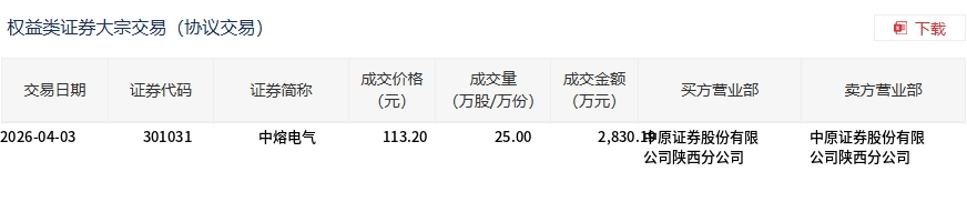 4月3日,中熔電氣大宗交易成交25萬股,成交額2830.19萬元,占當(dāng)日總成交額的13.69%,成交價(jià)113.2元,較市場收盤價(jià)133.23元折價(jià)15.03%。