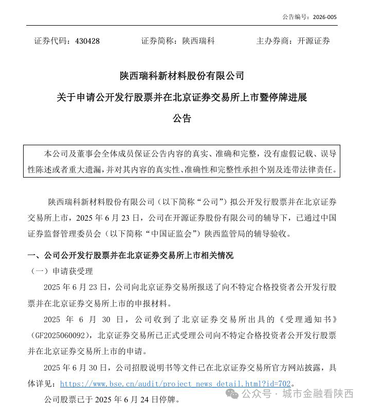 3月31日,陜西瑞科新材料股份有限公司(下文簡稱陜西瑞科)發(fā)布公告稱,因公司公開發(fā)行股票并在北京證券交易所上市的申請文件所引用的財務報告即將屆滿有效期,公司已向北交所提交中止審核申請,北交所于2026年3月30日同意中止發(fā)行上市審核。