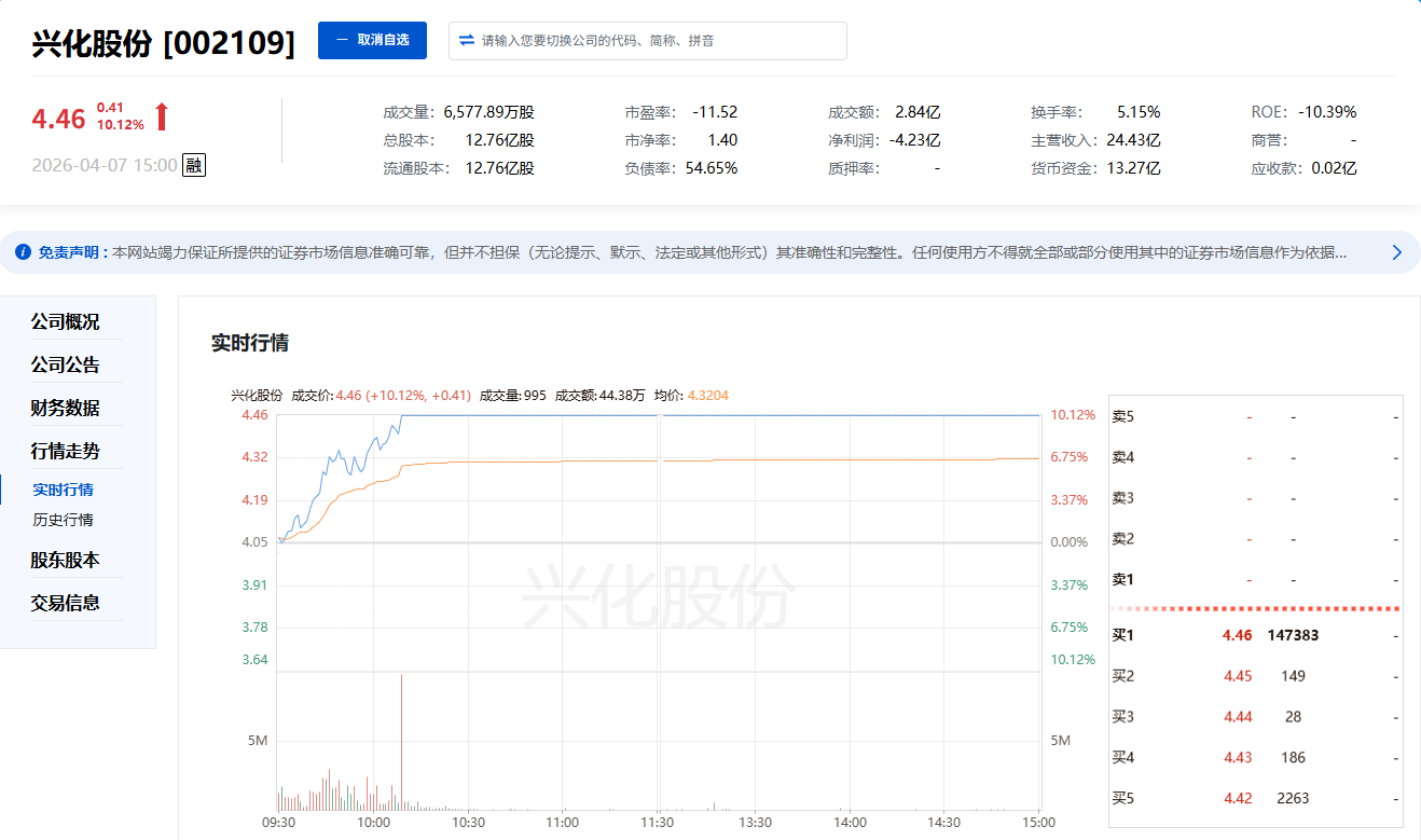 清明假期后首個(gè)交易日,A股市場(chǎng)震蕩修復(fù),陜西板塊表現(xiàn)活躍。其中,興化股份(002109)開(kāi)盤(pán)后股價(jià)快速拉升,早盤(pán)即封死漲停板,最終以4.46元收盤(pán),單日漲幅達(dá)10.12%。