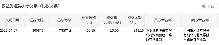 首都在線今日大宗交易折價成交13萬股,成交額345.15萬元