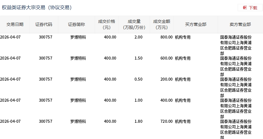 4月7日,羅博特科大宗交易成交6.8萬股,成交額2720萬元,占當(dāng)日總成交額的0.83%,成交價400元,較市場收盤價436元折價8.26%。