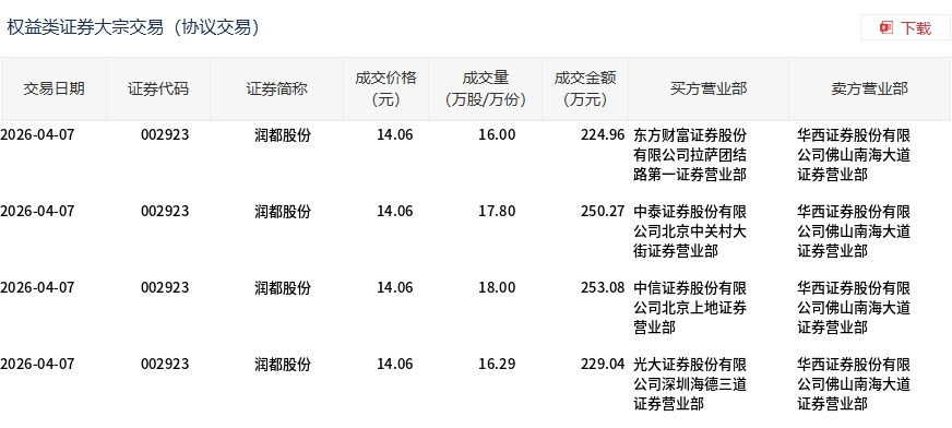 4月7日,潤(rùn)都股份大宗交易成交68.09萬(wàn)股,成交額957.35萬(wàn)元,占當(dāng)日總成交額的1.7%,成交價(jià)14.06元,較市場(chǎng)收盤(pán)價(jià)14.52元折價(jià)3.17%。