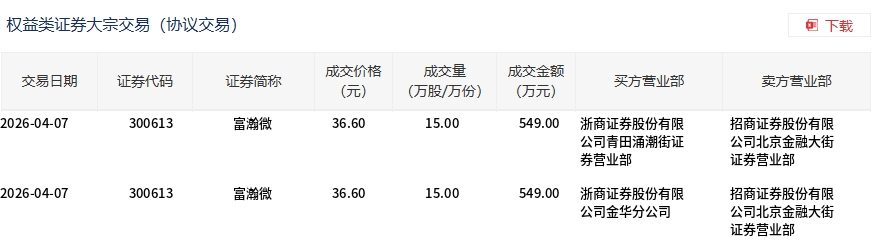 4月7日,富瀚微大宗交易成交30萬股,成交額1098萬元,占當(dāng)日總成交額的7.5%,成交價(jià)36.6元,較市場(chǎng)收盤價(jià)41.24元折價(jià)11.25%。