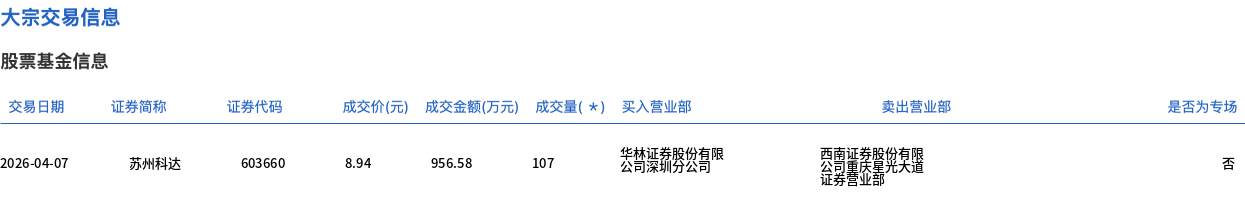 蘇州科達(dá)今日大宗交易平價成交107萬股,成交額956.58萬元