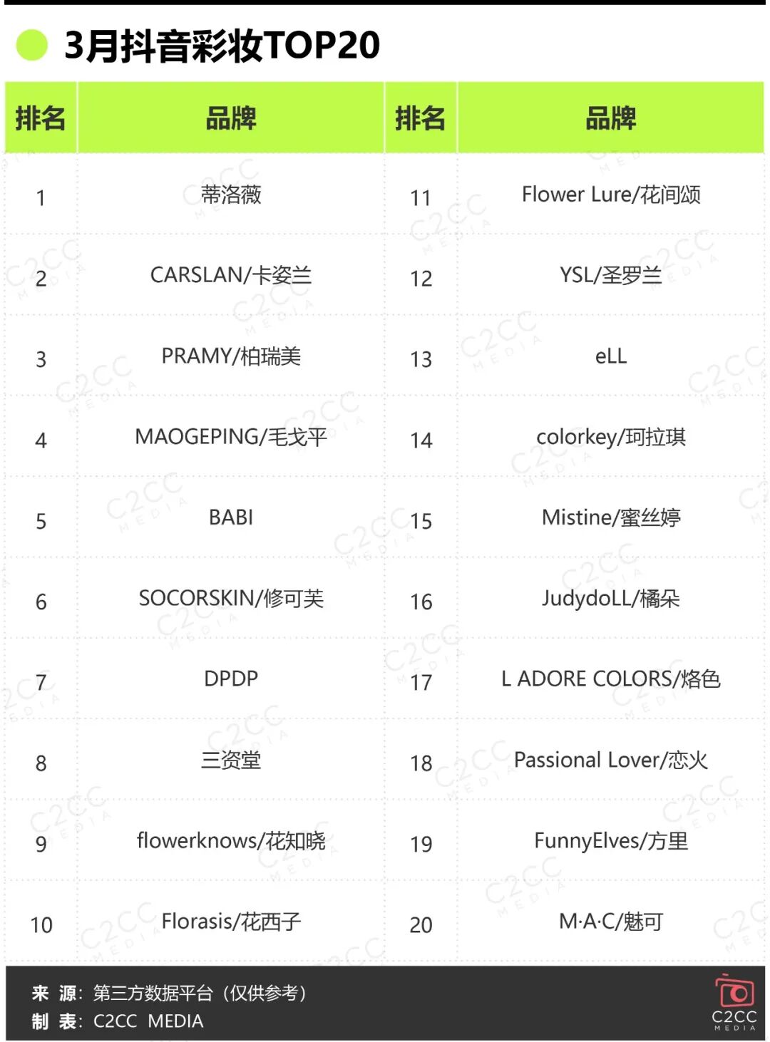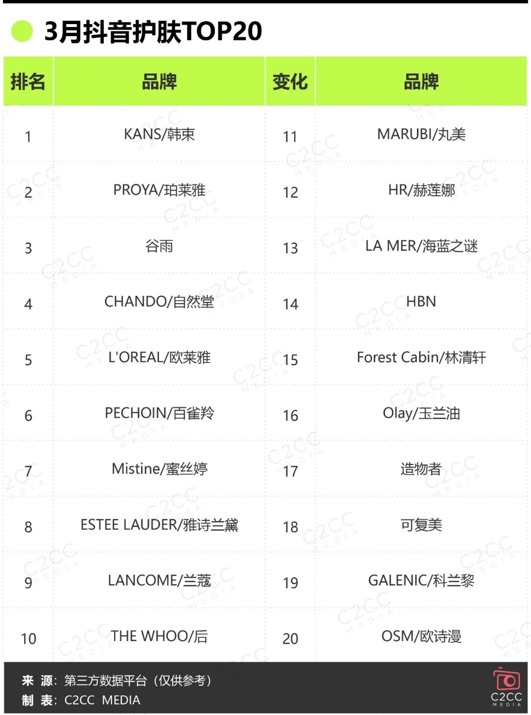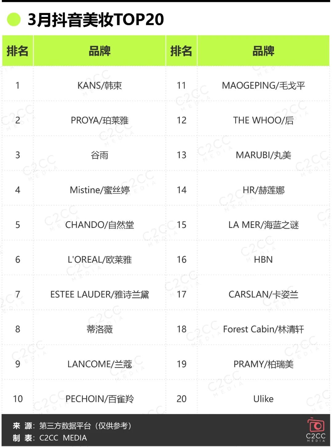在優(yōu)勝劣汰加速、品類更加細(xì)分的美妝行業(yè),各品牌競爭激烈,各月以及年度榜單頻繁洗牌,C2CC傳媒X新妝也將持續(xù)關(guān)注后續(xù)榜單排名,從數(shù)據(jù)中洞察美妝發(fā)展動態(tài)以及增長機(jī)會點。
