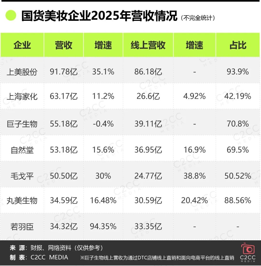 可以發(fā)現(xiàn),線上渠道已成品牌增長核心,除上海家化外,上美股份、巨子生物等五家企業(yè)線上營收占比均超50%。