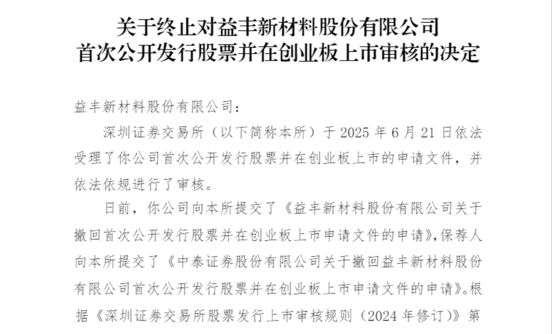 日前,益豐新材料股份有限公司(下稱“益豐新材”)披露的公告顯示,因公司及保薦人中泰證券申請撤回IPO材料,深交所決定終止對公司首次公開發(fā)行股票并在創(chuàng)業(yè)板上市的審核。此前,益豐新材IPO申請已于2025年6月21日獲受理。