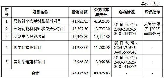 據(jù)益豐新材披露的招股書,其原擬在深交所創(chuàng)業(yè)板發(fā)行新股不超過4736萬股,且占發(fā)行后總股本比例不低于25%,原募集資金8.44億元擬用于高折射率光學(xué)樹脂材料項目、高端功能材料環(huán)狀聚烯烴項目、研發(fā)中心建設(shè)項目、數(shù)字化建設(shè)項目、營銷渠道建設(shè)項目。