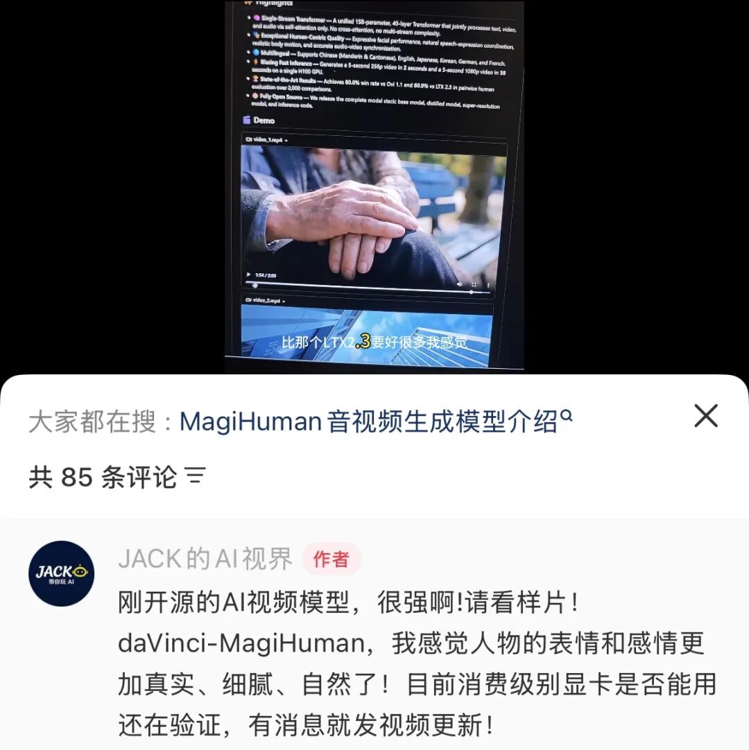 模型本身的局限也不該被數(shù)字掩蓋。小紅書博主@JACK的AI視界 曾第一時(shí)間部署、實(shí)測了daVinci-MagiHuman。發(fā)現(xiàn)它跑起來需要H100,普通消費(fèi)級(jí)顯卡基本沒戲,雖然社區(qū)在研究量化方案,但短期內(nèi)個(gè)人用戶想本地部署還是有難度。