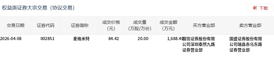 4月8日,麥格米特大宗交易成交20萬股,成交額1688.4萬元,占當(dāng)日總成交額的0.96%,成交價84.42元,較市場收盤價102.5元折價17.64%。
