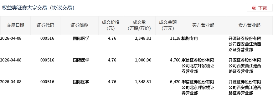 4月8日,國(guó)際醫(yī)學(xué)大宗交易成交4697.62萬(wàn)股,成交額2.24億元,占當(dāng)日總成交額的51.06%,成交價(jià)4.76元,較市場(chǎng)收盤價(jià)5.01元折價(jià)4.99%。