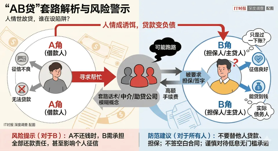 《IT時(shí)報(bào)》記者注意到,2026年1月,河南平頂山市公安局的官網(wǎng)發(fā)布了該公安局破獲一起特大“AB貸”合同詐騙案的詳細(xì)過程:李某(B角)和張某(A角)在某助貸公司處貸了24萬元,除了簽署《貸款居間服務(wù)合同》外,還有一份“補(bǔ)充協(xié)議”,承諾六個(gè)月后保證把貸款轉(zhuǎn)到張某名下。但等到銀行催收還款時(shí),這份協(xié)議卻成了推卸責(zé)任的工具:“這是你們之間的借貸糾紛。”