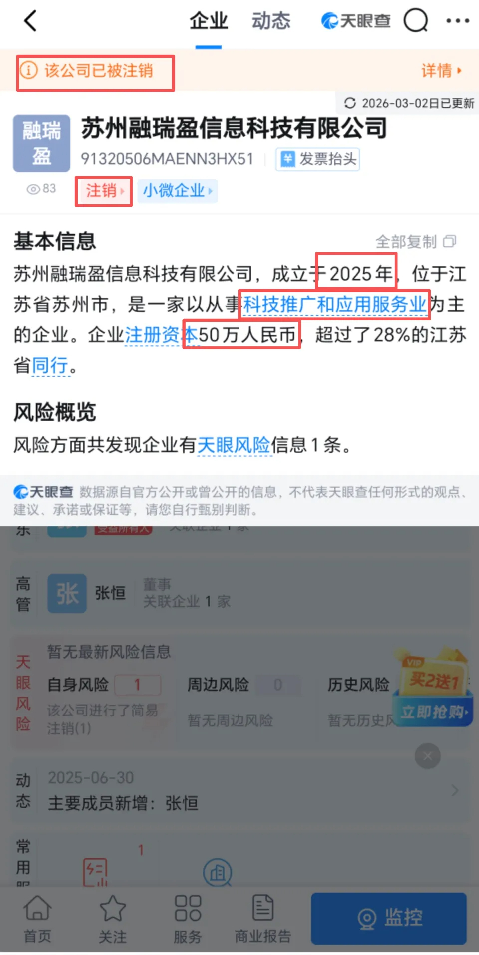 天眼查顯示,這家公司成立于2025年6月30日,注冊(cè)資本為50萬元,定位是主要從事科技推廣和應(yīng)用服務(wù)業(yè)的企業(yè),并無與金融相關(guān)的業(yè)務(wù)資質(zhì)。2026年1月23日,公司注銷。
