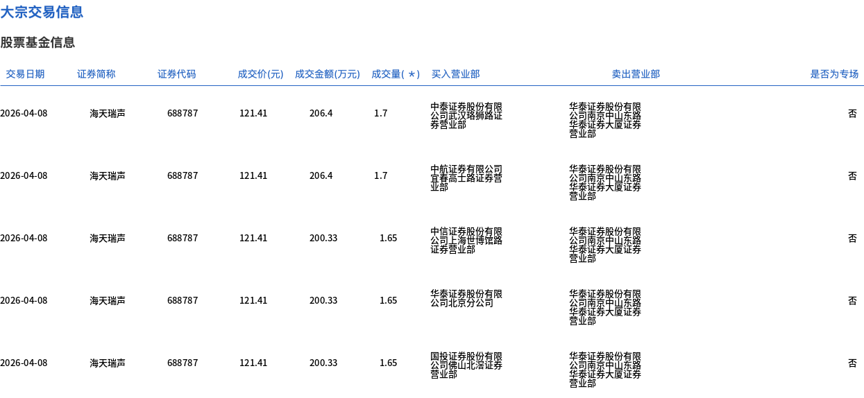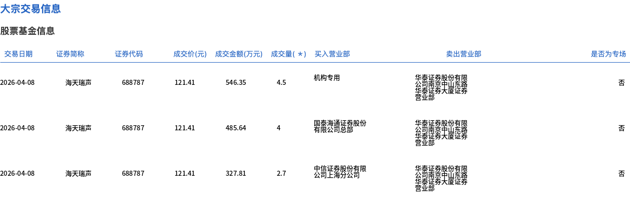 4月8日,海天瑞聲大宗交易成交19.55萬股,成交額2373.59萬元,占當日總成交額的5.09%,成交價121.41元,較市場收盤價133.42元折價9%。