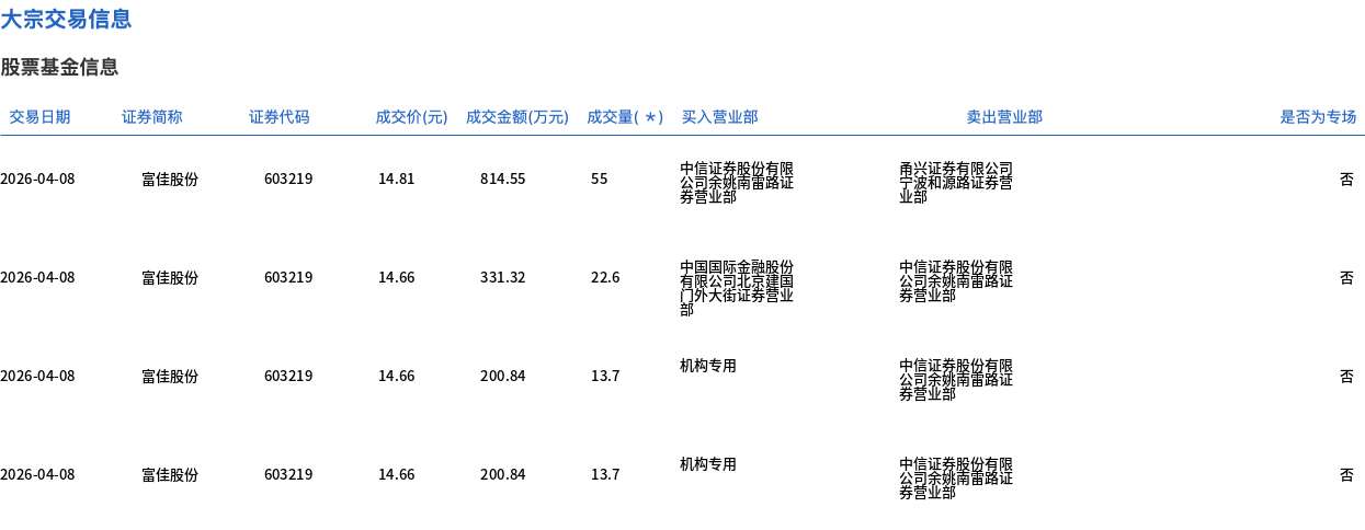 4月8日,富佳股份大宗交易成交105萬股,成交額1547.55萬元,占當日總成交額的20.21%,成交均價14.74元,較市場收盤價16.29元折價9.52%,其中最高成交價14.81元,最低成交價14.66元。