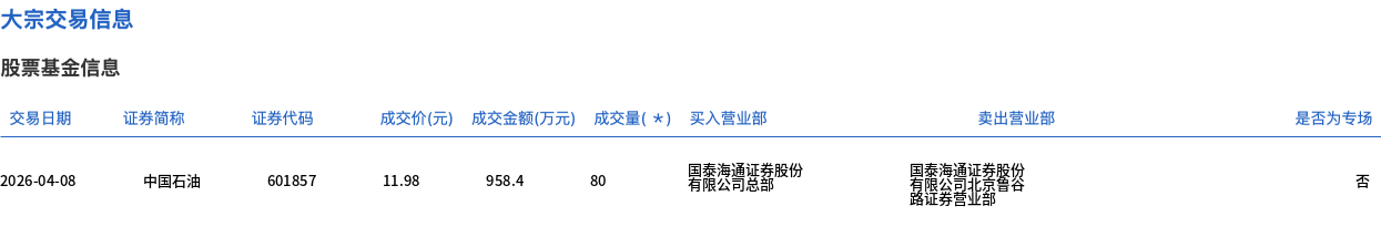 4月8日,中國石油大宗交易成交80萬股,成交額958.4萬元,占當(dāng)日總成交額的0.22%,成交價(jià)11.98元,較市場收盤價(jià)11.98元持平。