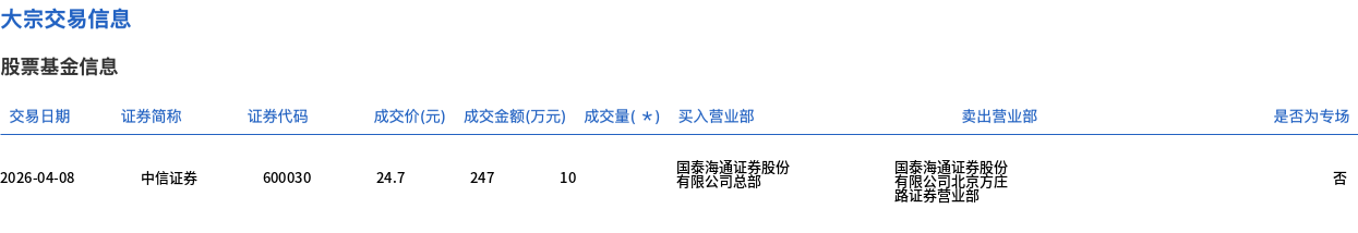 4月8日,中信證券大宗交易成交10萬股,成交額247萬元,占當(dāng)日總成交額的0.07%,成交價(jià)24.7元,較市場(chǎng)收盤價(jià)24.7元持平。
