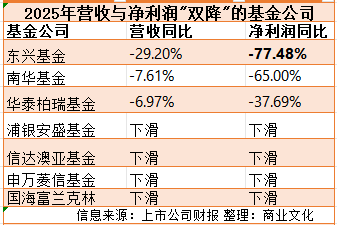 去年,有7家基金公司2025年?duì)I收和凈利潤(rùn)同比雙雙下滑。其中,東興基金公司是雙降幅度最大者,凈利潤(rùn)暴跌超77%。