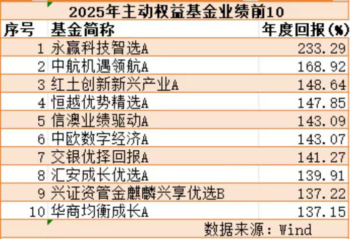 值得關(guān)注的是,業(yè)績(jī)排名前十的基金產(chǎn)品全部為主動(dòng)權(quán)益類(lèi)基金,它們無(wú)一例外地重倉(cāng)了以AI算力為核心的科技板塊。其中,永贏科技智選A以233.29% 的年度回報(bào)率奪冠,成為市場(chǎng)上罕見(jiàn)的“兩倍基”。