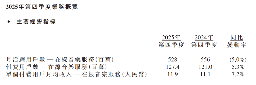 從最新財(cái)報(bào)數(shù)據(jù)來看,騰訊音樂的表現(xiàn)并不算差,無論收入還是利潤均有雙位數(shù)百分比增長:2025年全年收入同比增長15.8%至329億元;非國際財(cái)務(wù)報(bào)告準(zhǔn)則下,歸母凈利潤同比增長25%至95.9億元。第四季度,騰訊音樂在線音樂單個付費(fèi)用戶月均收入(ARPPU)達(dá)到11.9元,同比增長7.2%。