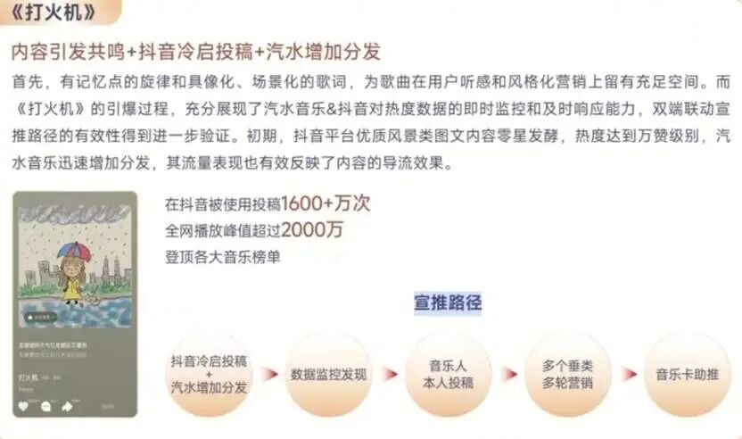 以《打火機(jī)》這首歌的宣推過程為例,其起初通過抖音的風(fēng)景類圖文內(nèi)容發(fā)酵,熱度達(dá)到萬贊級別后,汽水音樂增加分發(fā),再疊加不同垂類的達(dá)人投稿和音樂卡推薦等資源進(jìn)行營銷,完成爆款打造。