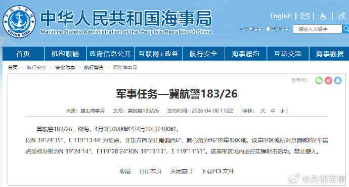 據(jù)中國海事局網(wǎng)站消息,唐山海事局發(fā)布航行警告,4月9日22時(shí)至24時(shí)、4月9日0時(shí)至4月10日24時(shí),渤海部分海域進(jìn)行實(shí)彈射擊活動(dòng),禁止駛?cè)搿????