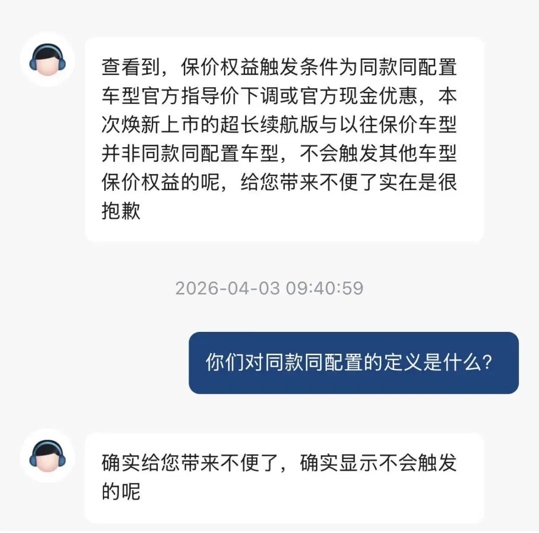 電廠就此情況向深藍汽車的官方客服進行詢問,得到了類似的回復(fù),客服稱:“本次煥新上市的超長續(xù)航版與以往保價車型并非同款同配置車型,不會觸發(fā)其他車型保價權(quán)益?!?/p>