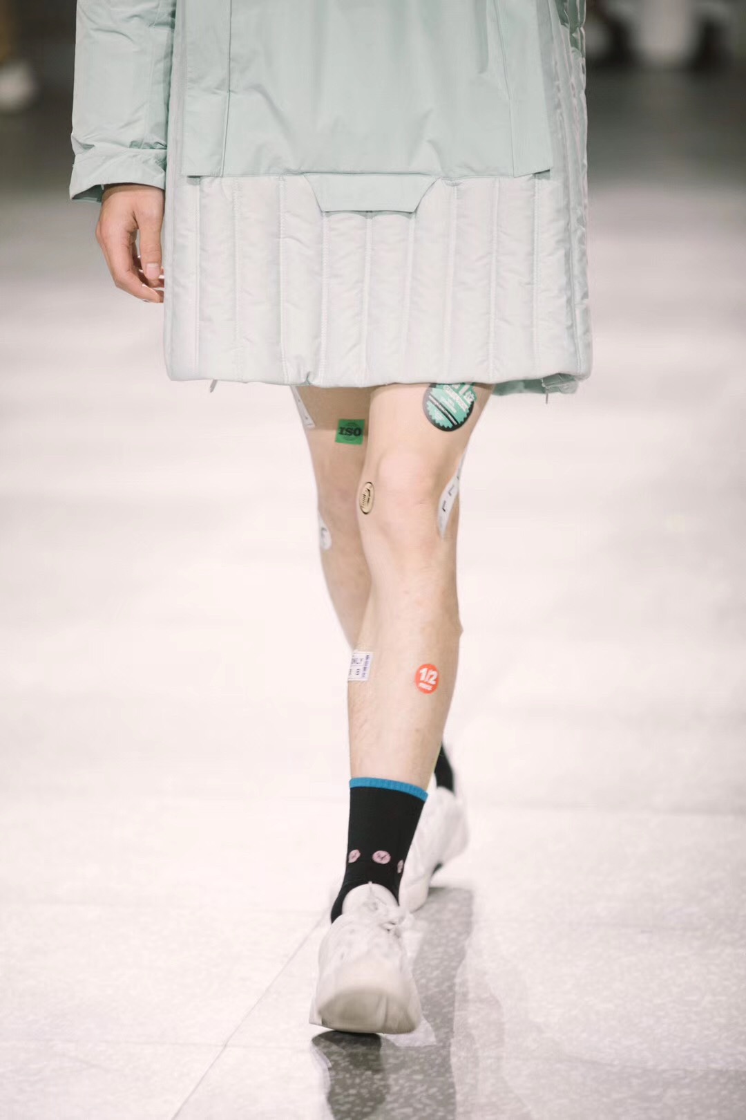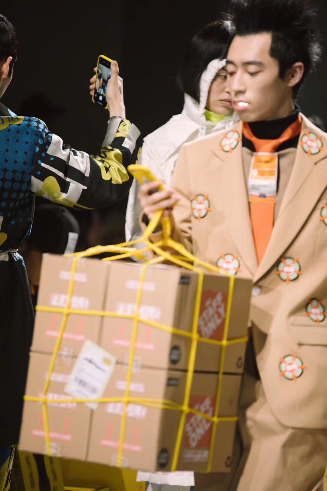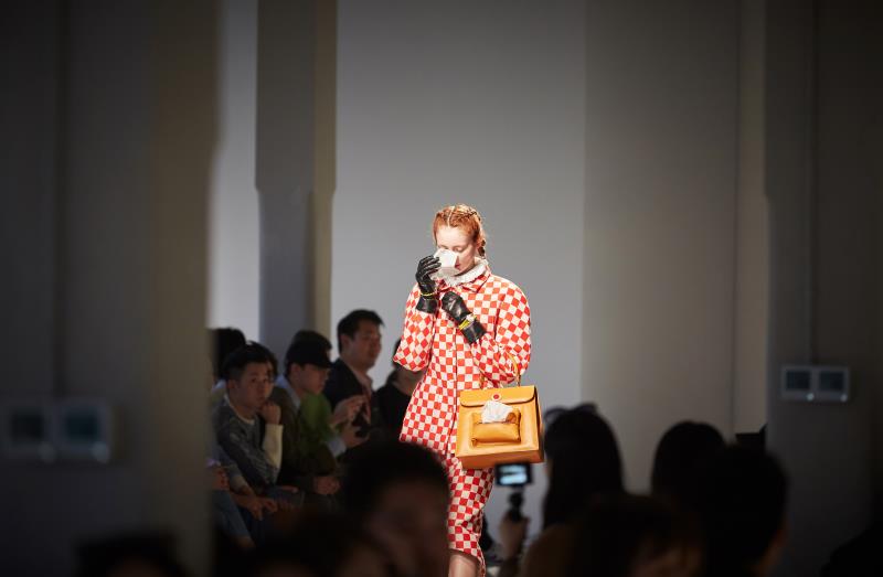 邀請函便是一個很好的“100% Consumer(百分百消費者)”主題體現(xiàn),層層包裹著的快遞盒子里其實什么都沒有,反諷了消費時代的過度包裝問題。而秀場上模特們一邊邁著急匆匆的步伐,還一邊低著頭刷手機,有趣的是,秀場上的觀眾們此時也舉著手機記錄這一幕,讓這個主題顯得更加微妙了。