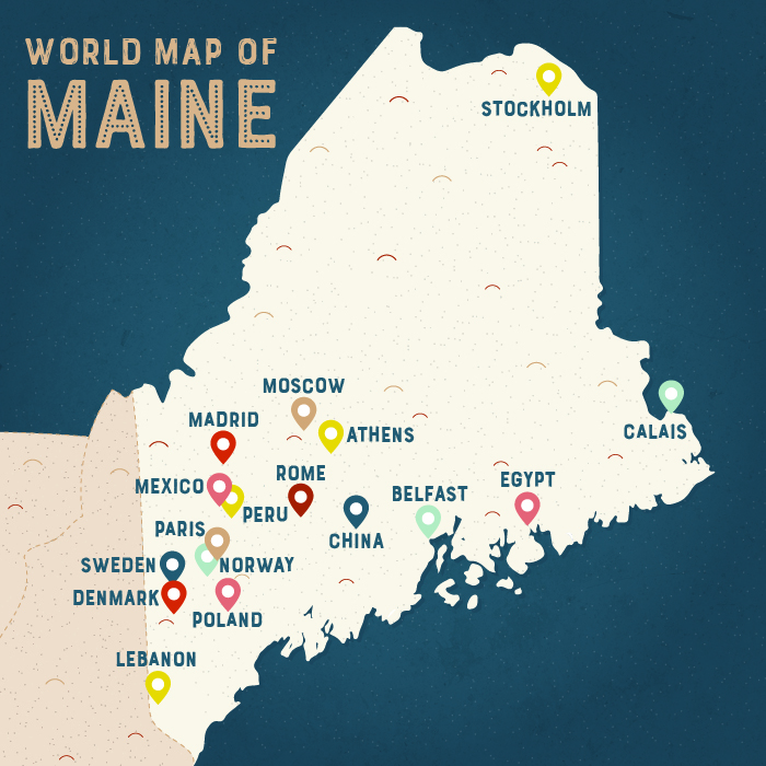 隨著越來越多的舊大陸移民來到美洲,這片土地上亦有越來越多的地點(diǎn)被移民用他們熟悉的稱呼來命名。在美國的各大城市,以某移民群體的母國命名的地區(qū)司空見慣,如“唐人街”“小意大利”“日本城”等等。不過最有代表性,也最讓人驚訝的當(dāng)屬緬因州:這個(gè)位于美國東北角的州有著諸多以海外國家和城市命名的城鎮(zhèn),那里有挪威、巴黎、丹麥、羅馬、瑞典、貝爾法斯特,甚至中國。有趣的是,美國作家卡洛琳·丘特(Carolyn Chute)曾寫過一部題為《緬因州埃及市的豆子》(The Beans of Egypt, Maine)的小說,她特地虛構(gòu)了“埃及市”這個(gè)地方,用來暗示緬因州眾多稀奇古怪的“洋地名”,但小說家自己也沒有想到,緬因州還真的有這么個(gè)地方。
