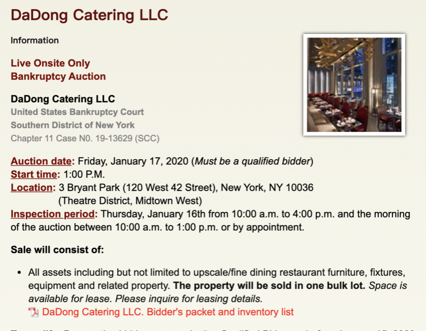 Moecker Auctions,Inc.是一家位于美國(guó)佛羅里達(dá)州的知名拍賣公司,主要業(yè)務(wù)是為各種類型的資產(chǎn)在全州范圍內(nèi)進(jìn)行拍賣。根據(jù)官網(wǎng)信息,紐約大董的拍賣將于美國(guó)時(shí)間1月17日下午1點(diǎn)開(kāi)始進(jìn)行,出售包括高級(jí)家具、固定裝置、廚房設(shè)備等在內(nèi)的所有固定資產(chǎn),同時(shí)店面也可供出售或租賃。