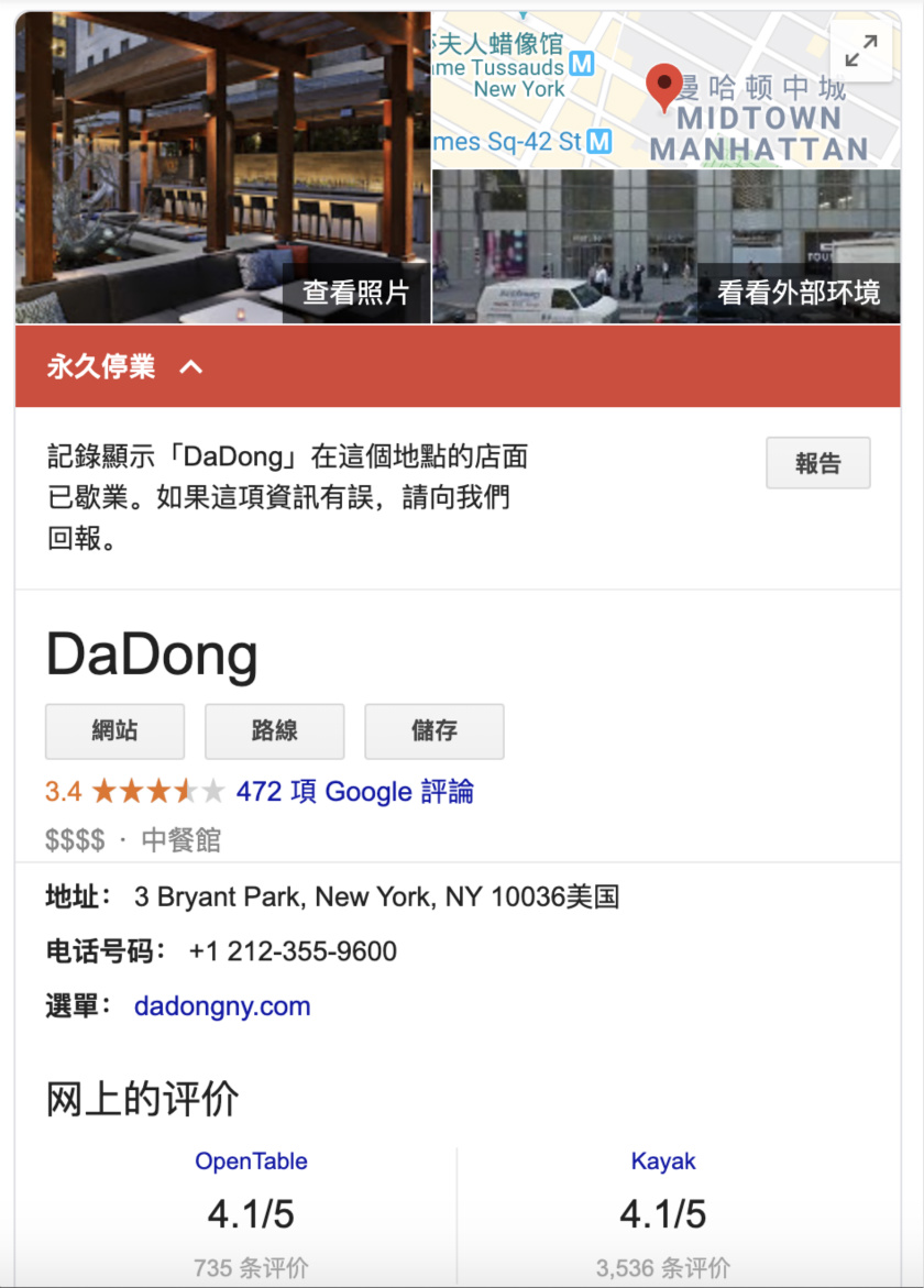 界面新聞在Google上搜索紐約大董烤鴨,發(fā)現(xiàn)它位于紐約市Bryant Park的店面顯示永久停業(yè),其Facebook上的最后一條帖子也停留在2019年11月7日。為求證此事,界面新聞多次撥打大董烤鴨美國(guó)及中國(guó)公司電話,但截至發(fā)稿均無(wú)人接聽(tīng)。