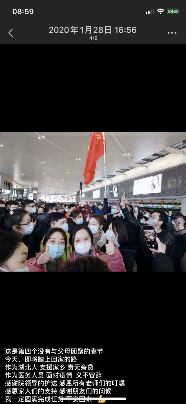 護(hù)士長(zhǎng)看到我的報(bào)名消息,哭了。她告訴我,一定要每天報(bào)平安??剖彝踔魅味谖覀円a(bǔ)充營養(yǎng),一定保護(hù)好自己,平安回來!科室里,很多同事都報(bào)名參加了支援武漢行動(dòng),我的科室戰(zhàn)友徐筠老師就已經(jīng)在臘月三十接到通知,奔赴武漢。