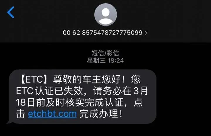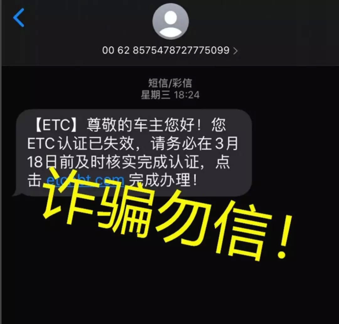近日,有多位網(wǎng)民收到這樣一條短信:稱車主的ETC認(rèn)證已失效,為了避免影響通行,請(qǐng)務(wù)必在3月18日前完成認(rèn)證。短信內(nèi)還附帶了一個(gè)“認(rèn)證”鏈接。收到此類短信務(wù)必提高警惕,切勿點(diǎn)擊來(lái)路不明的網(wǎng)頁(yè)鏈接,也不要隨意將銀行卡信息和密碼對(duì)外透露。有任何疑問(wèn)及時(shí)撥打110或與自己當(dāng)時(shí)辦理ETC的相關(guān)銀行進(jìn)行咨詢核實(shí)。