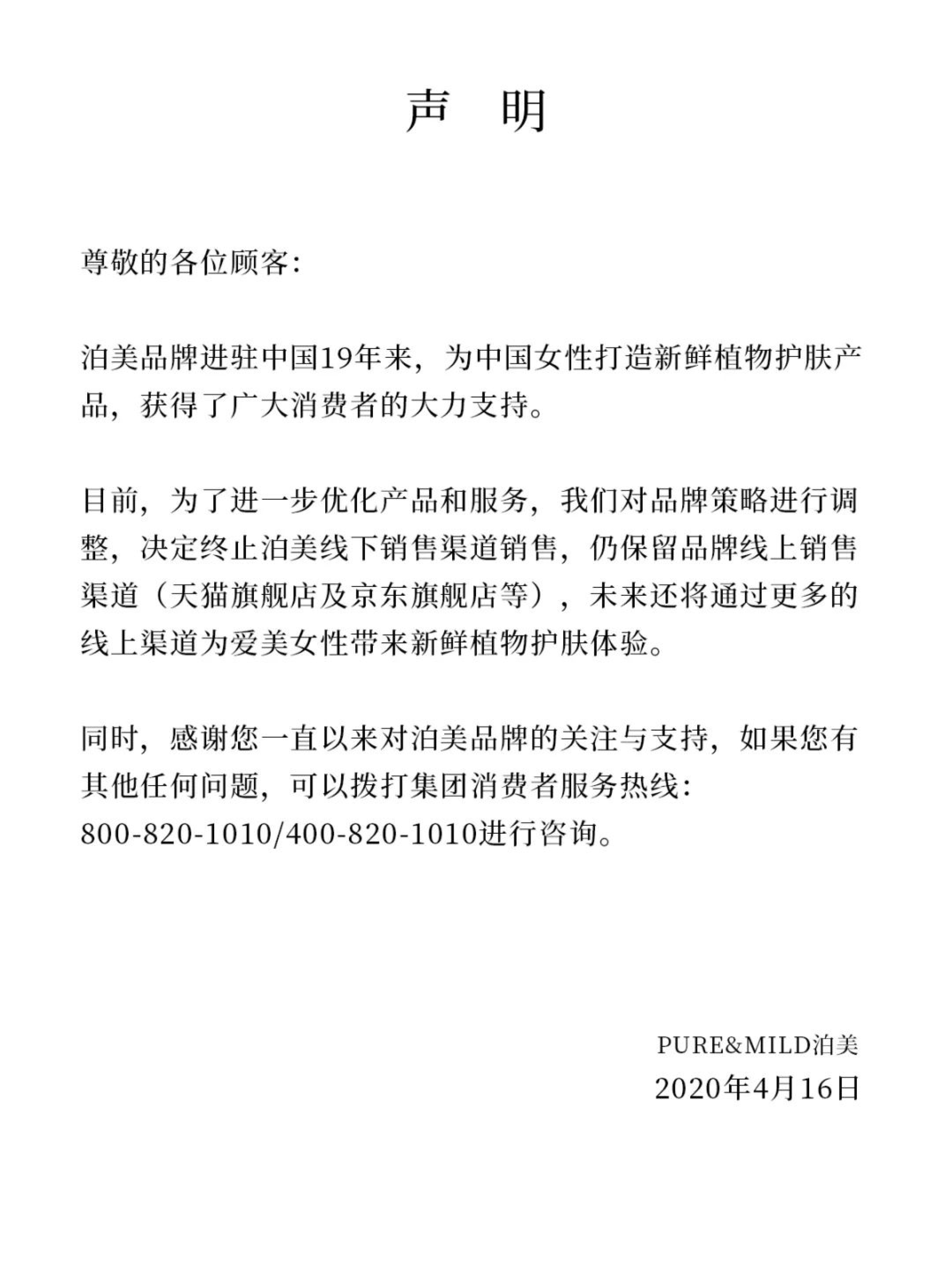 4月16日,資生堂旗下品牌泊美在其公眾號發(fā)布聲明,宣布“終止泊美線下渠道銷售,仍保留品牌線上銷售渠道(天貓旗艦店及京東旗艦店等)”。