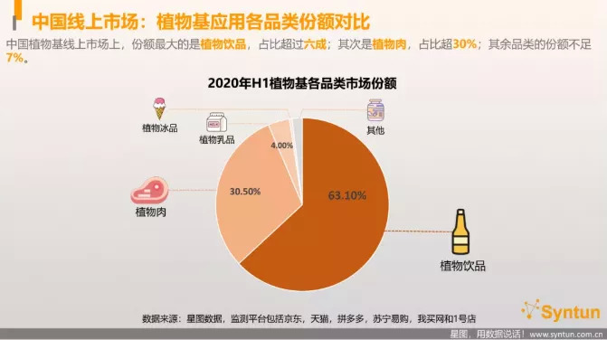 來(lái)自星圖數(shù)據(jù)的資料顯示,在上半年,中國(guó)植物基線上市場(chǎng)銷售額同比增速高達(dá)158%,至8.73億元。其中,植物飲品為份額最大的品類,占比達(dá)63.10%。而天貓7月發(fā)布的 《2020植物蛋白飲料創(chuàng)新趨勢(shì)》則顯示,2020年植物蛋白飲料市場(chǎng)增速高達(dá)800%,購(gòu)買(mǎi)人數(shù)上升900%。
