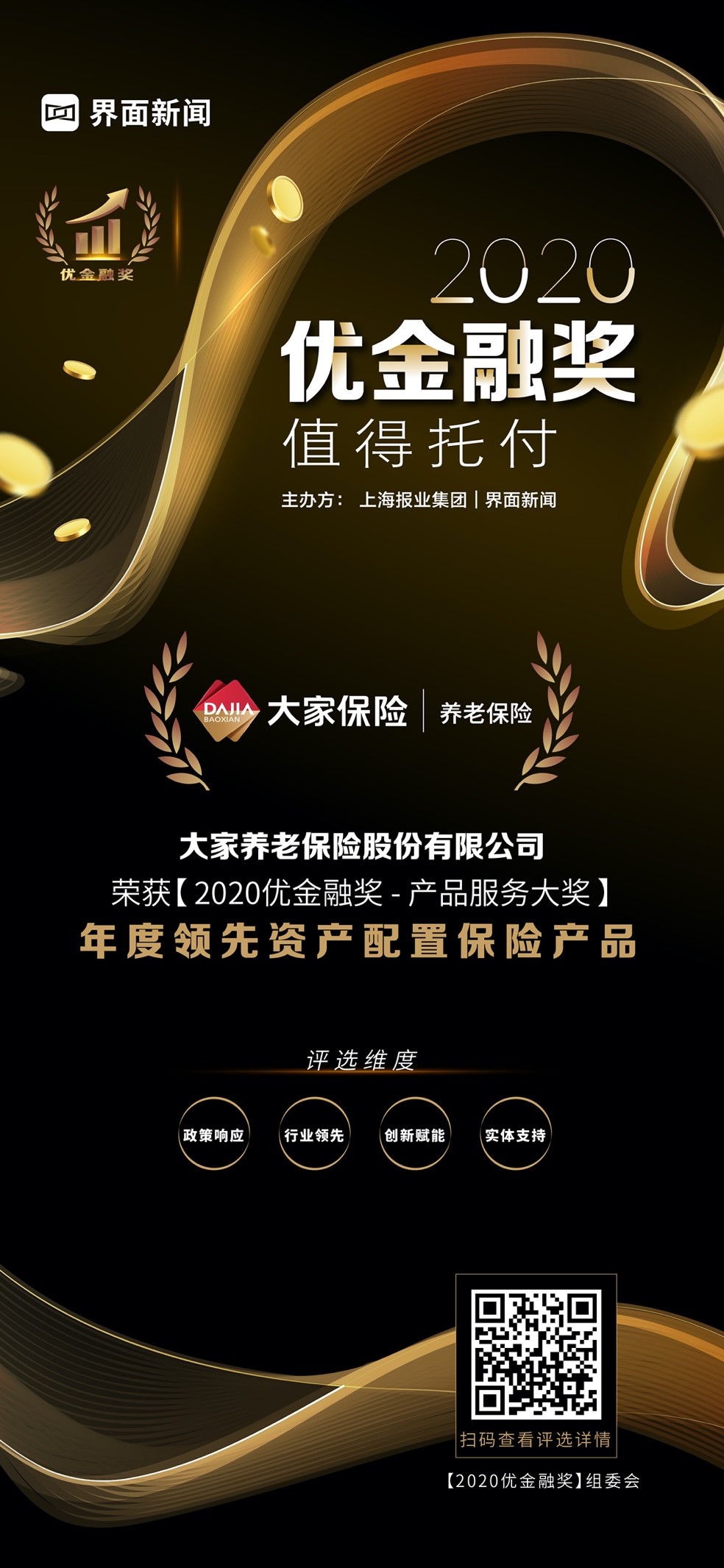 12月23日,上海報(bào)業(yè)集團(tuán)l界面新聞在在上海靜安瑞吉酒店舉辦了【2020優(yōu)金融獎(jiǎng)】頒獎(jiǎng)典禮,并正式公布了本年度獲獎(jiǎng)名單。在這項(xiàng)萬眾期待的金融業(yè)年度評(píng)選中,來自銀行、保險(xiǎn)、證券、基金、信托、期貨、投資、財(cái)管、金融科技的38家金融機(jī)構(gòu)與企業(yè),憑借年度市場(chǎng)表現(xiàn)與行業(yè)影響力,獲得年度大獎(jiǎng)。其中,大家養(yǎng)老保險(xiǎn)憑借其在行業(yè)內(nèi)的優(yōu)異表現(xiàn),榮膺產(chǎn)品服務(wù)大獎(jiǎng)——年度領(lǐng)先資產(chǎn)配置保險(xiǎn)產(chǎn)品。