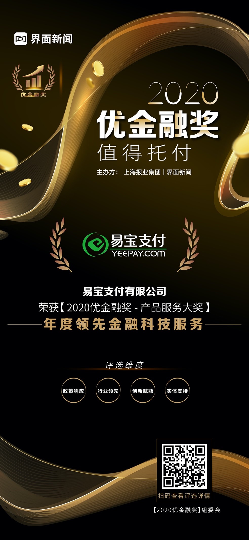 12月23日,上海報業(yè)集團l界面新聞在在上海靜安瑞吉酒店舉辦了【2020優(yōu)金融獎】頒獎典禮,并正式公布了本年度獲獎名單。在這項萬眾期待的金融業(yè)年度評選中,來自銀行、保險、證券、基金、信托、期貨、投資、財管、金融科技的38家金融機構與企業(yè),憑借年度市場表現(xiàn)與行業(yè)影響力,獲得年度大獎。其中,易寶支付憑借其在行業(yè)內的優(yōu)異表現(xiàn),榮膺產(chǎn)品服務大獎——年度領先金融科技服務。