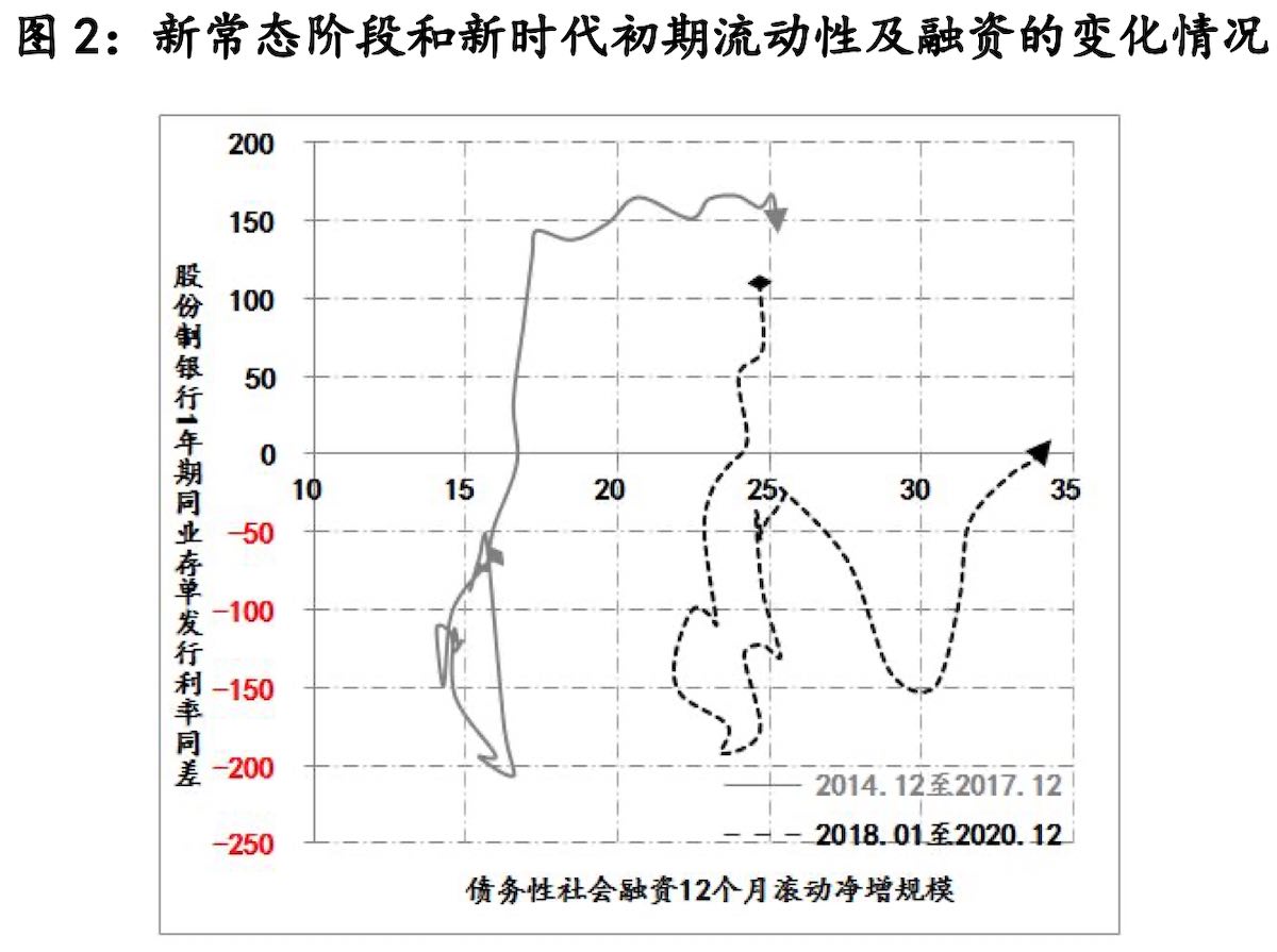 若按照新常態(tài)時(shí)期,穩(wěn)杠桿操作的經(jīng)驗(yàn)(社融穩(wěn)定同時(shí),商業(yè)銀行長(zhǎng)期資金利率上升,當(dāng)社融重返擴(kuò)張之后,資金利率才得以穩(wěn)定),預(yù)計(jì)明年純債務(wù)性社會(huì)融資12個(gè)月滾動(dòng)凈增量將穩(wěn)定在目前35萬億左右的水平,但商業(yè)銀行長(zhǎng)期資金利率則會(huì)繼續(xù)上升,以股份制銀行為例,其1年期的同業(yè)存單發(fā)行利率可能回升至4.3%以上,即在穩(wěn)杠桿和兼顧經(jīng)濟(jì)恢復(fù)的訴求下,流行性狀況略緊,但融資環(huán)境不會(huì)大起大落,金融對(duì)實(shí)體的支持力度能夠得到保持。