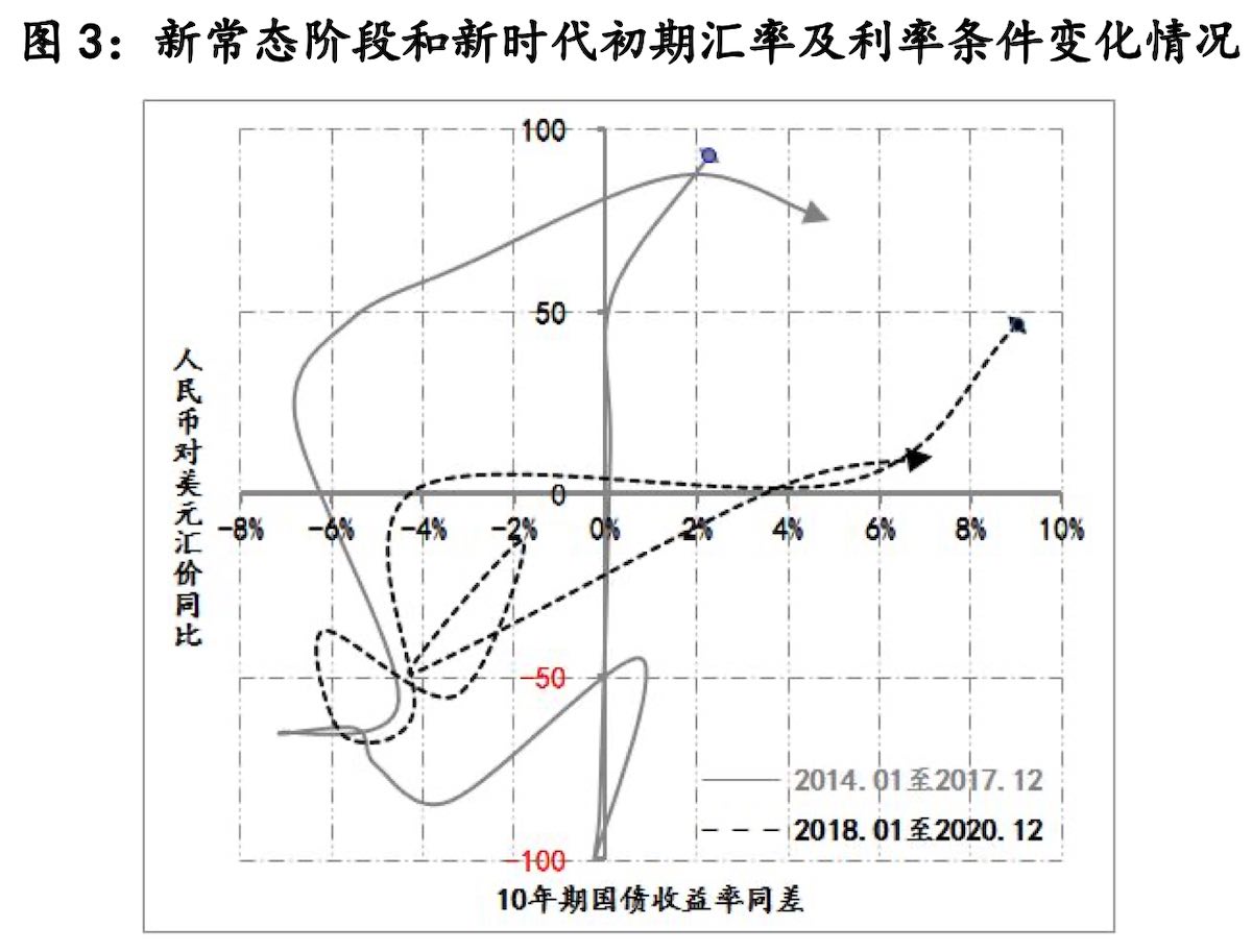 因此,綜上,2021年人民幣內(nèi)外價(jià)格條件雖然會(huì)在收斂區(qū)間內(nèi)(人民幣匯價(jià)同比和10年國(guó)債收益率同差均為正值),但進(jìn)一步收斂的空間有限,2021年很可能的組合是“匯率在目前位置保持基本穩(wěn)定+利率在目前位置窄幅震蕩”。