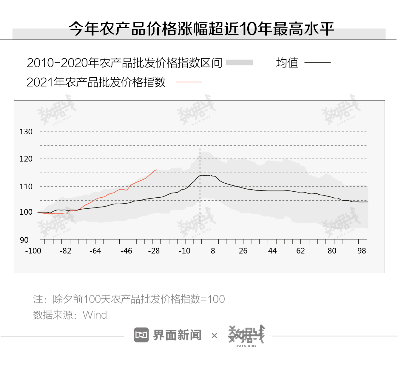 Wind數(shù)據(jù)顯示,今年春節(jié)前食品開啟快速漲價(jià)模式的時(shí)間比往年更早,幅度也更強(qiáng)。2021年農(nóng)產(chǎn)品批發(fā)價(jià)格指數(shù)明顯高于近10年平均水平。