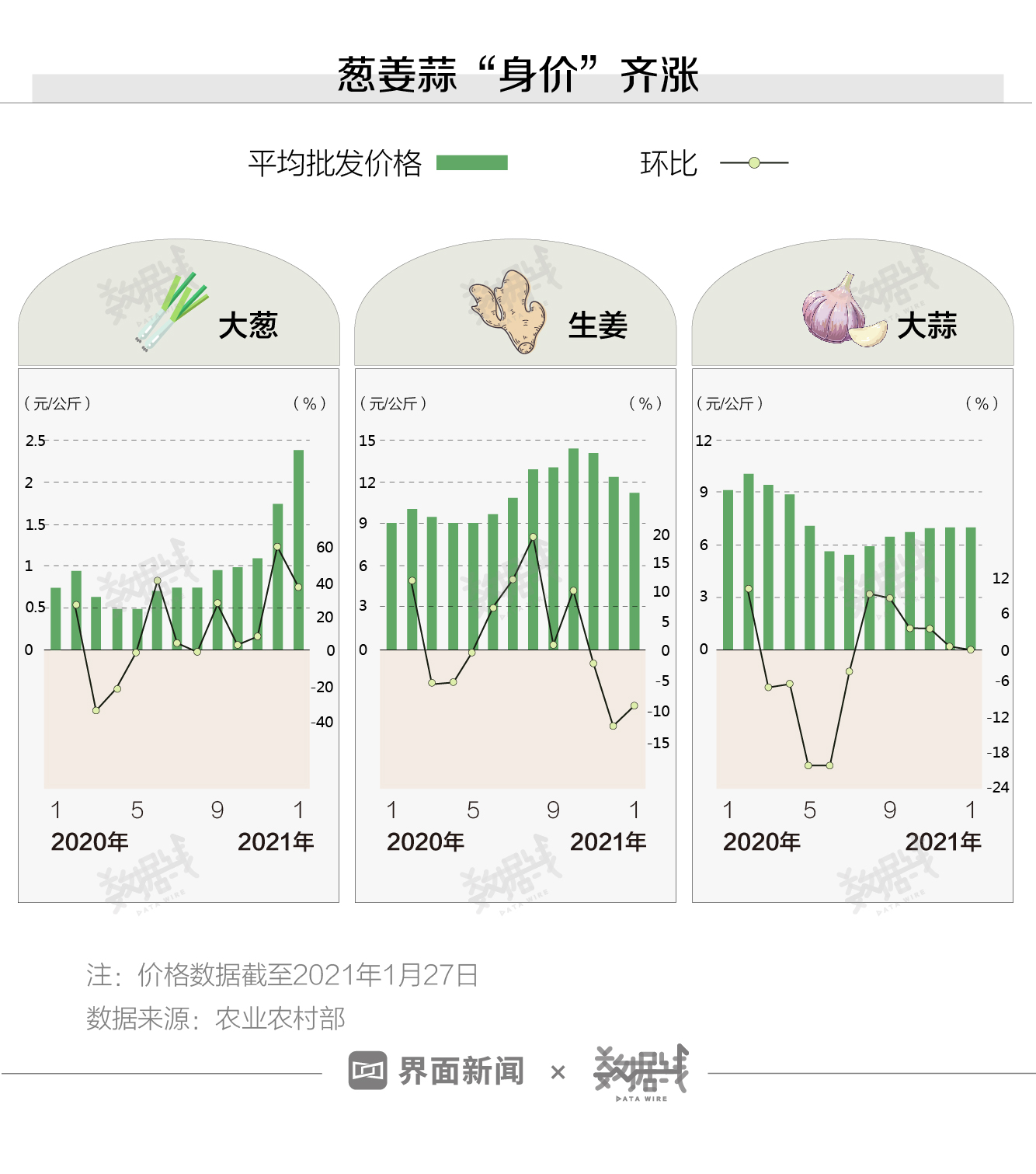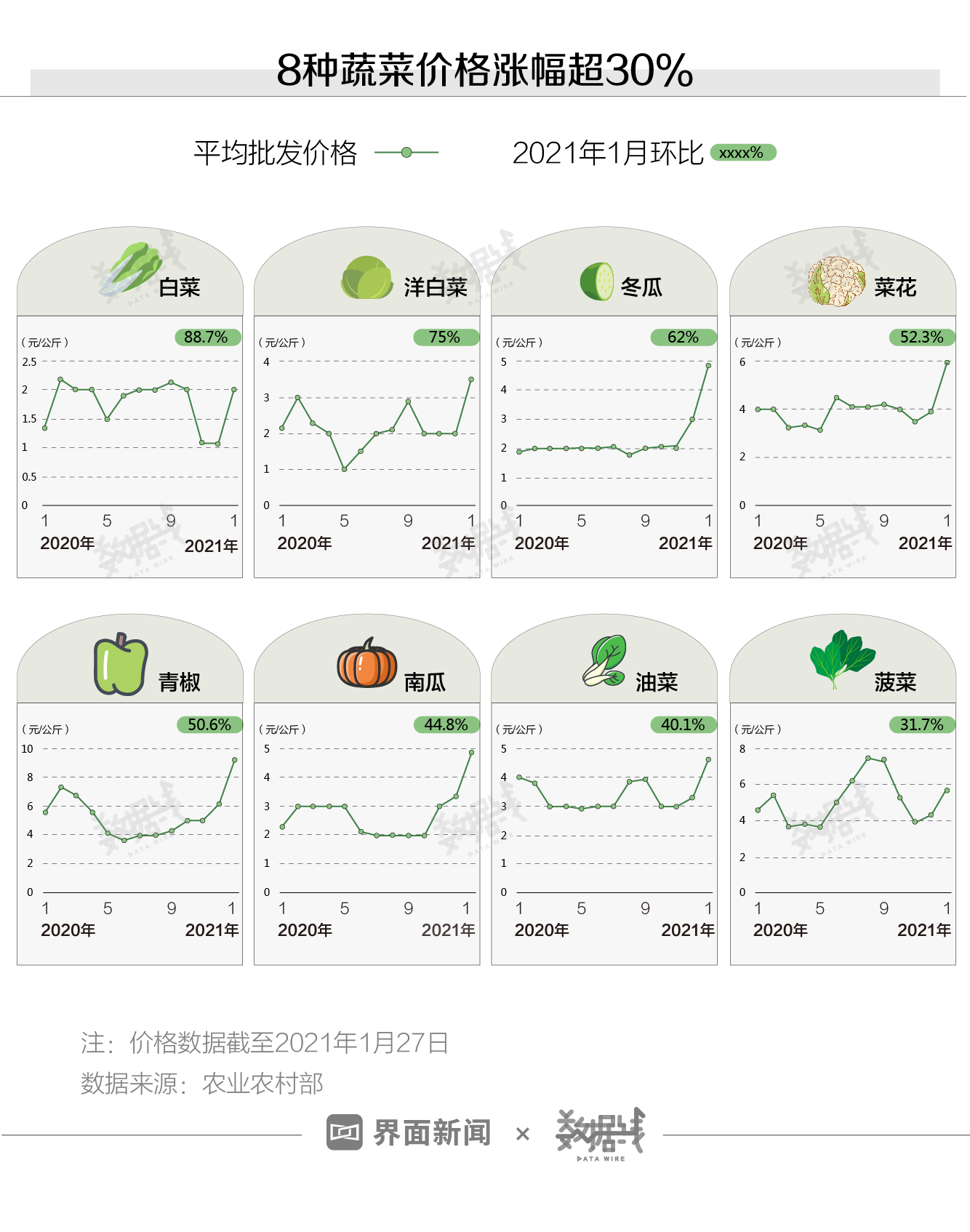 據(jù)農(nóng)業(yè)農(nóng)村部數(shù)據(jù),2021年1月,有8種蔬菜平均批發(fā)價(jià)格環(huán)比漲幅超過30%。