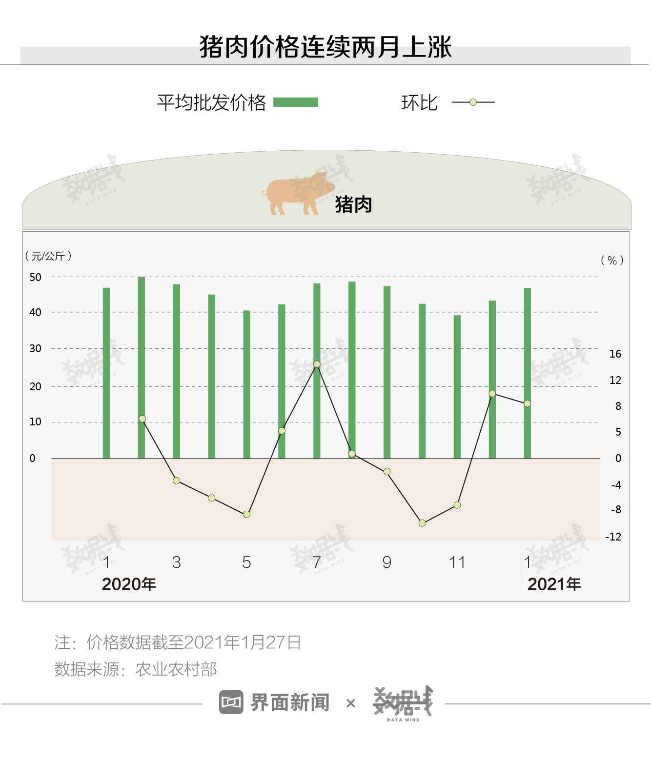 2021年1月,豬肉平均批發(fā)價(jià)格為46.81元/公斤,2個(gè)月來增長近19%。1月18日,國家統(tǒng)計(jì)局局長寧吉喆表示,2020年全年豬肉價(jià)格同比漲幅達(dá)49.7%。最新數(shù)據(jù)顯示,豬肉價(jià)格再次進(jìn)入上漲通道。