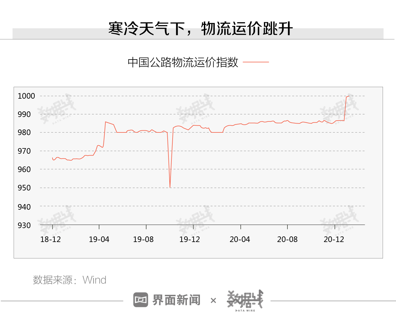 運(yùn)輸成本升高讓農(nóng)產(chǎn)品價(jià)格隨之“水漲船高”。入冬以來,全國各地氣溫創(chuàng)歷史新低,物流運(yùn)價(jià)“跳升”。據(jù)中國物流與采購聯(lián)合會(huì),2021年1月18日至1月22日,中國公路物流運(yùn)價(jià)指數(shù)為1001.46點(diǎn),比上月同期增長超15個(gè)點(diǎn)。