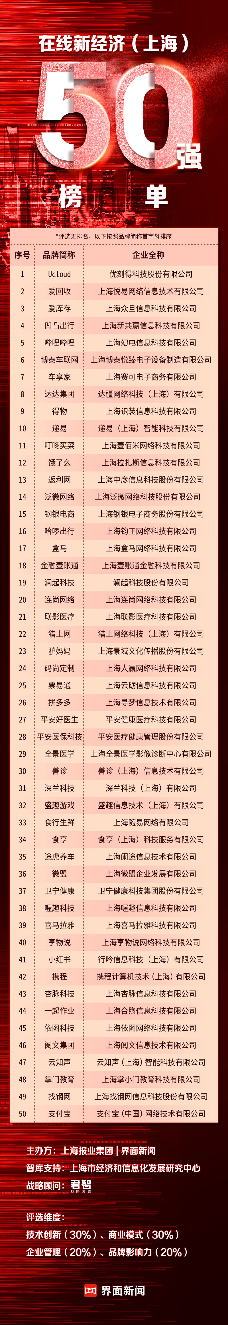 去年,上海報(bào)業(yè)集團(tuán) | 界面新聞舉辦了第一屆“在線新經(jīng)濟(jì)(上海)50強(qiáng)”評選活動,取得各界廣泛關(guān)注,活動受到上海市經(jīng)濟(jì)和信息化發(fā)展研究中心、復(fù)旦大學(xué)管理學(xué)院等高校、智庫的大力支持,收到數(shù)百家企業(yè)報(bào)名資料,最終評選出了50家具有代表性的企業(yè)。為鼓勵(lì)企業(yè)持續(xù)創(chuàng)新,發(fā)揮企業(yè)優(yōu)勢助力產(chǎn)業(yè)數(shù)字化轉(zhuǎn)型,第二屆“在線新經(jīng)濟(jì)(上海)50強(qiáng)”評選即日啟動!誰是數(shù)字化轉(zhuǎn)型時(shí)期的新晉排頭兵?最終榜單名額虛位以待!