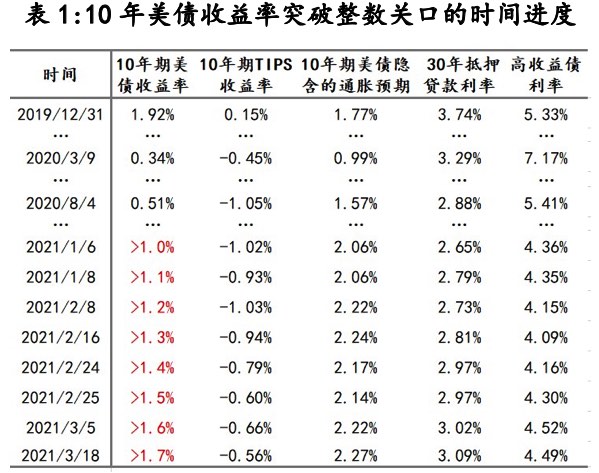 如表1所示,10年期美債收益率在本次上行中,速度是逐漸加快的,對此包括橋水的達里奧等市場人士表示美債收益率的上行會令美聯(lián)儲采取提前加息等收緊措施。但無論是美聯(lián)儲的議息會議,還是聯(lián)儲主席鮑威爾的表態(tài)中均集中釋放出一個信號:美聯(lián)儲不會提前改變當前的政策措施,即無視10年期美債收益率的上行。