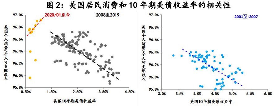 除了1000萬實際失業(yè)人數(shù)讓美聯(lián)儲無法退出寬松之外,還有一個重要原因就是本次美債收益率的上行尚未對美國居民消費產(chǎn)生沖擊,與10年期美債收益率由歷史低點回升同步,美國個人消費占可支配收入的比重也由96%上升至97%。與之相對,無論是金融危機前,還是金融危機之后,美債收益率基本與美國消費是呈相反關(guān)系的,但疫情以來,兩者的關(guān)系出現(xiàn)了明顯了變化。