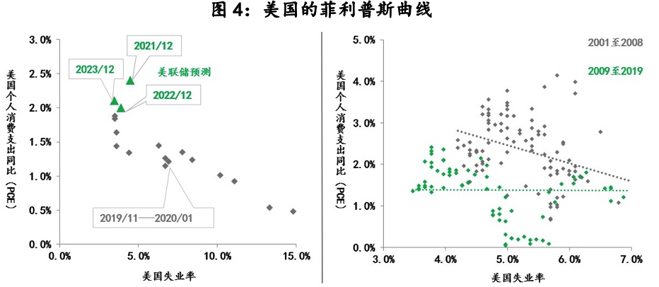 除了上文所述的就業(yè)缺口需彌補和消費仍在改善之外,與美國財政和貨幣政策雙寬松同步的是,美國的菲利普斯曲線開始重返陡峭化。去年8月27美聯(lián)儲宣布調(diào)整政策框架,在隨后美聯(lián)儲主席鮑威爾闡述中,“菲利普斯曲線平坦化”是聯(lián)儲政策框架調(diào)整的重要原因之一,而觀察美國通脹和失業(yè)的實際變化情況,金融危機后的菲利普斯曲線確實較危機前大幅平坦化,即低失業(yè)率并沒有帶來通脹水平的上升,而這也是導(dǎo)致美聯(lián)儲遲遲不能將其政策回歸正常的原因之一。