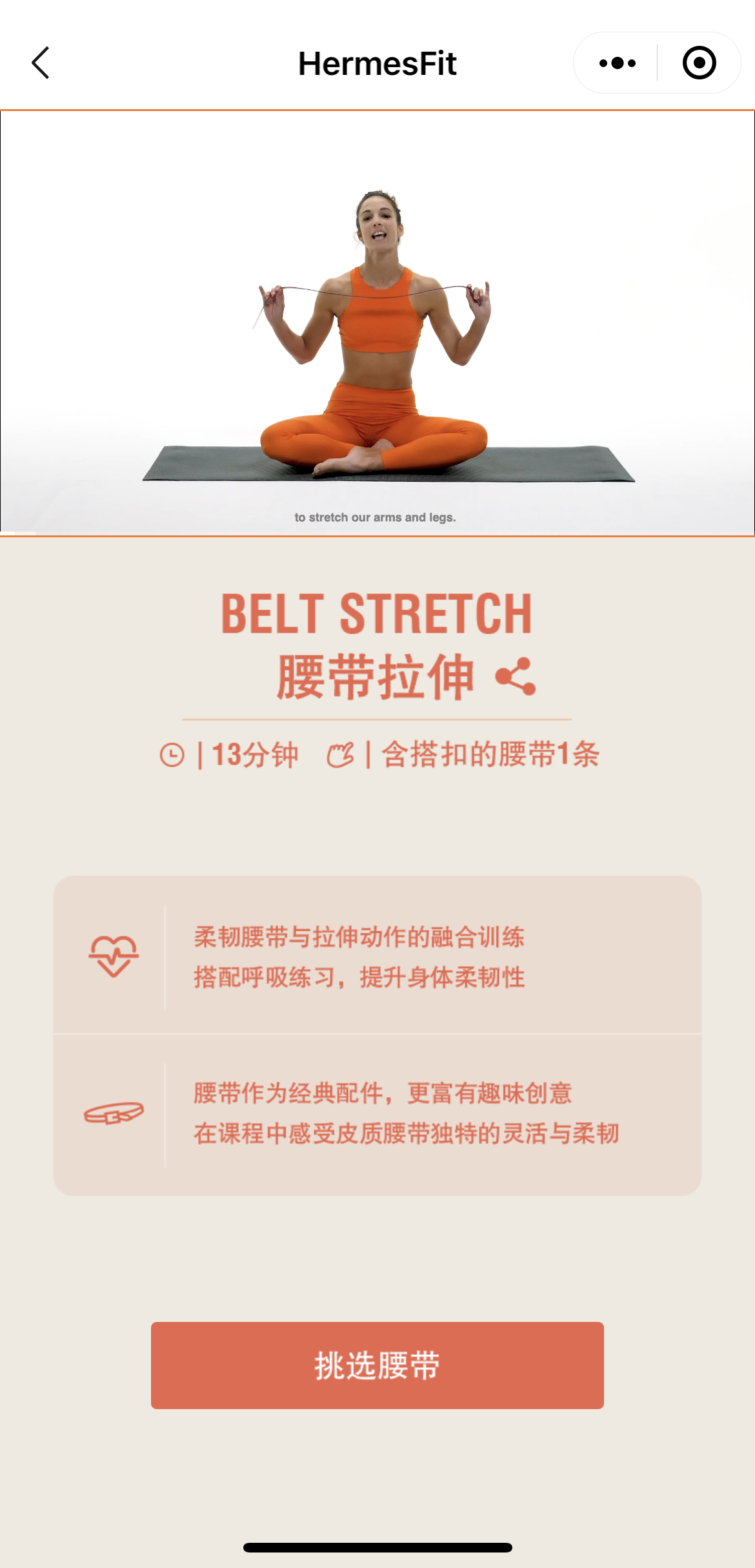 例如,在“腰帶拉伸柔韌身姿?”的子頁面中,一位瑜伽教師向消費(fèi)者示范如何使用一條含搭扣的愛馬仕腰帶作為輔助工具進(jìn)行拉伸。在視頻的下方,愛馬仕介紹道,用腰帶拉伸“搭配呼吸練習(xí),提升身體柔韌性”;同時(shí),“在課程中感受皮質(zhì)腰帶獨(dú)特的靈活與柔韌?!?/p>