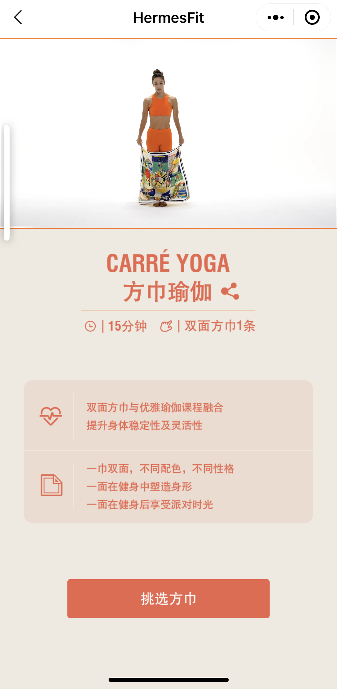 又比如,在“方巾瑜伽亮出活力色彩?”的子頁面中,這位瑜伽老師借助愛馬仕雙面方巾“提升身體靈活性及穩(wěn)定性”。愛馬仕還建議,一塊方巾可以在不同場景中搭配使用——除了有助于在健身塑造身形,還能“在健身后享受派對時(shí)光”。