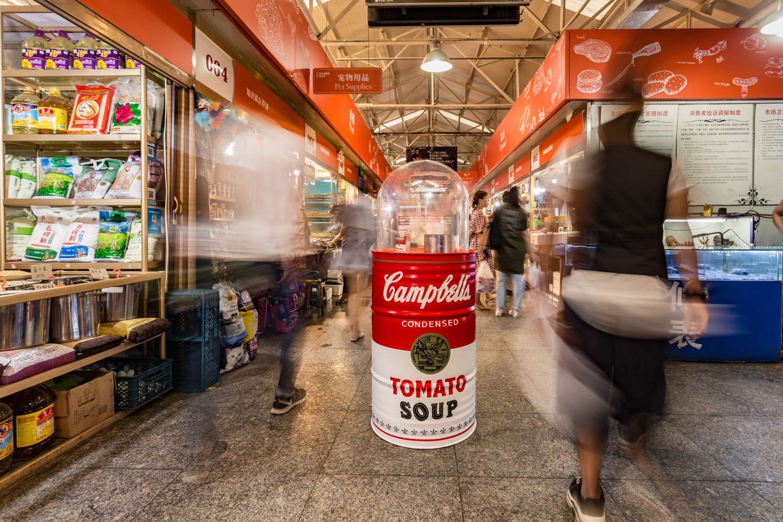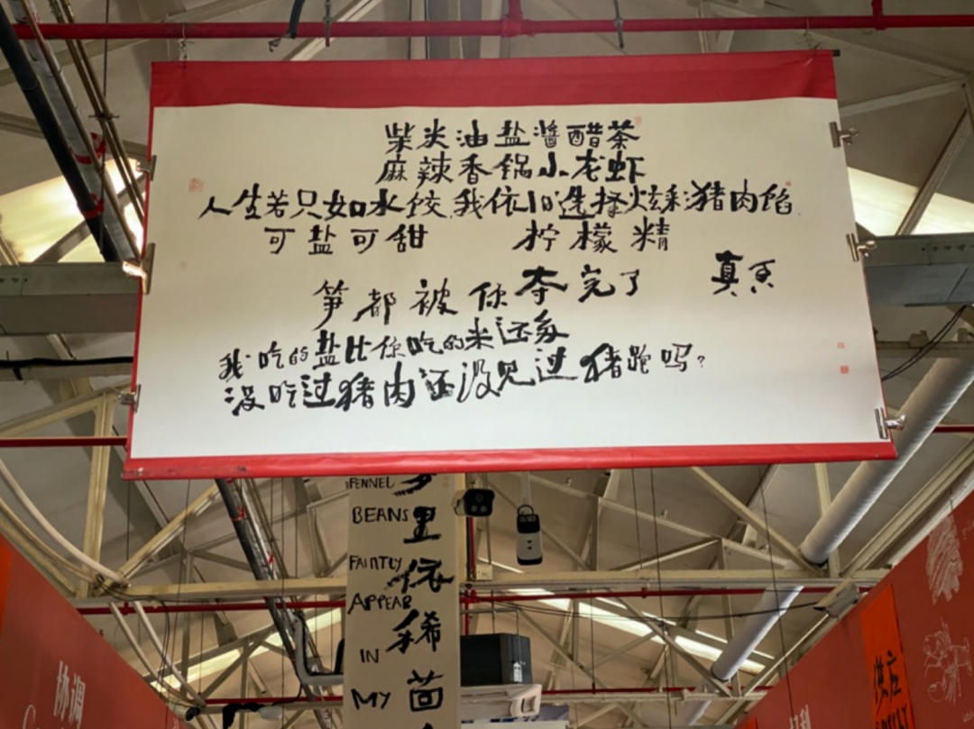 在過去的五一假期里,無數(shù)媒體、網(wǎng)紅和游客擠入這個菜市場,對著攤位上的標簽、店招和標語圍觀拍照。藝術(shù)家邱志杰在這里舉辦的“民以食為天”書法展,也成為近期社交網(wǎng)絡(luò)上最熱門的文化事件之一。